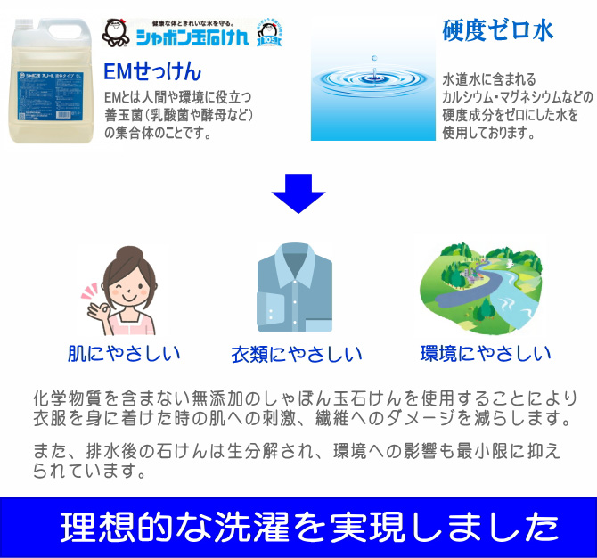 また無添加しゃぼん玉石けんは、アレルギー物質を含まないため、衣服を身に着ける方の肌への刺激も少なく、衣類自体の生地の劣化を抑え、なおかつ排水後も有機微生物により自然分解されるため環境にも負担が少ないと言われております。